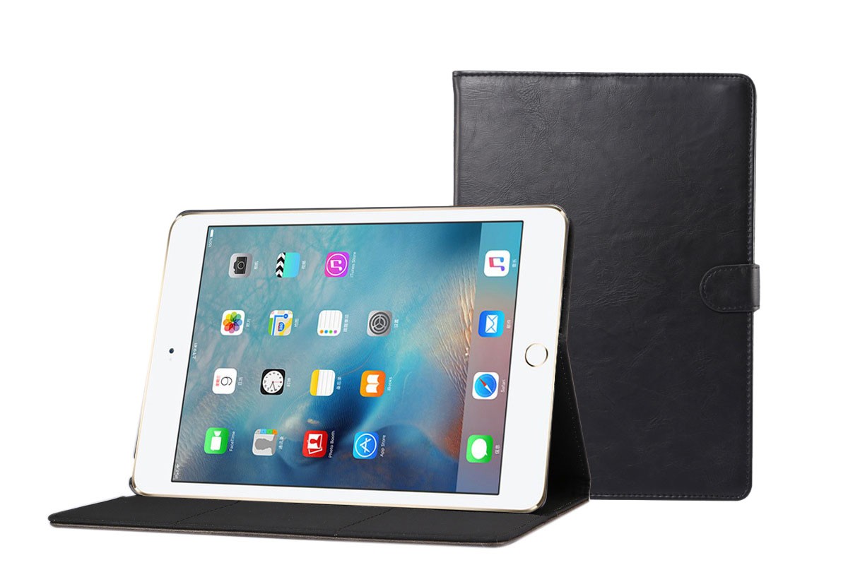 Zwart leren iPad mini hoes, geschikt voor de Apple iPad mini 1, de iPad mini 2 en de iPad mini 3. Deze hoes voelt zeer luxueus aan en is licht van gewicht. Alle functies en knoppen van de iPad mini, zoals de dock connector, volume knoppen en de camera zijn perfect te bedienen, zonder dat je de case hoeft te verwijderen. Het aanbrengen van de hoes is zeer eenvoudig, je klikt je tablet gewoon in de hoes.